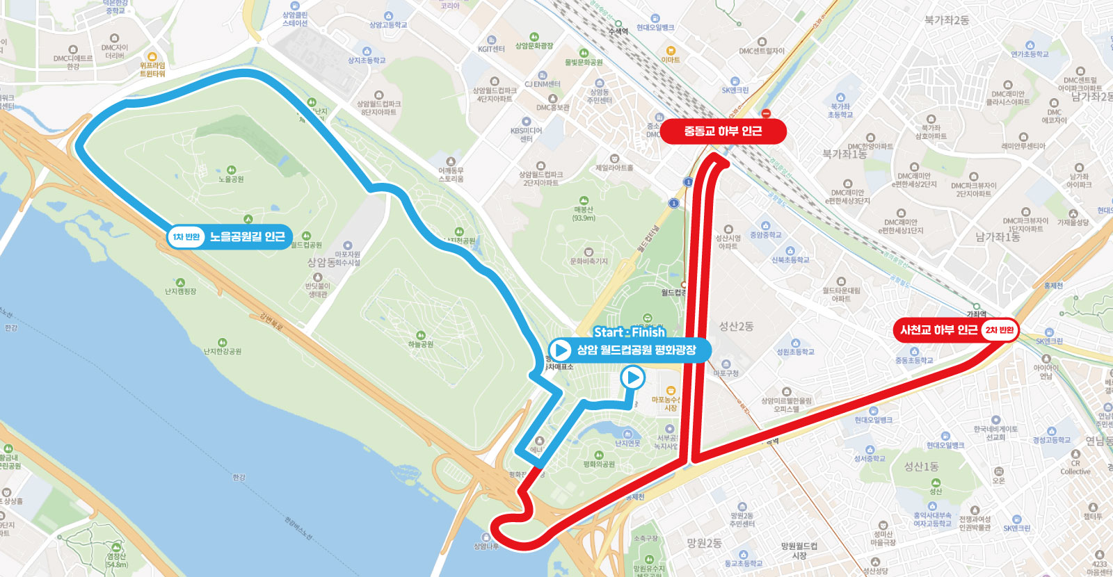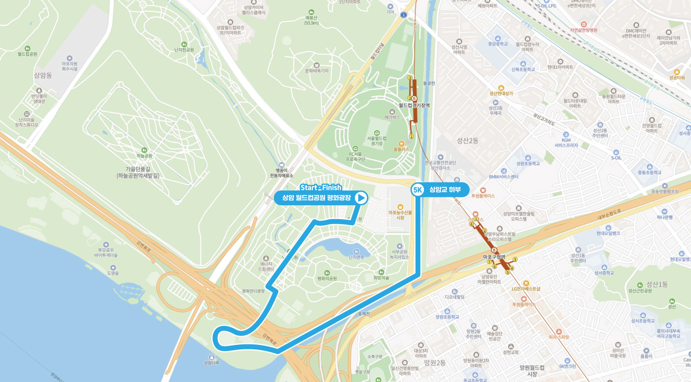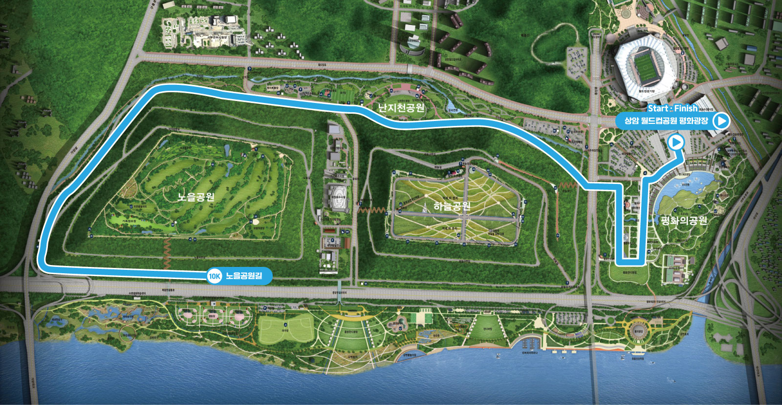 ※ 상암 월드컵공원 평화광장에서 "출발/도착" 하는 것은 변동없으나, 마라톤 주로 코스는 변경될 수 있습니다.